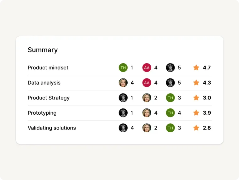 Vezpr’s aggregated scoring and shared comments make it easy to spot where opinions differ. This allows for quick follow-ups and informed discussions to reach the best decision.