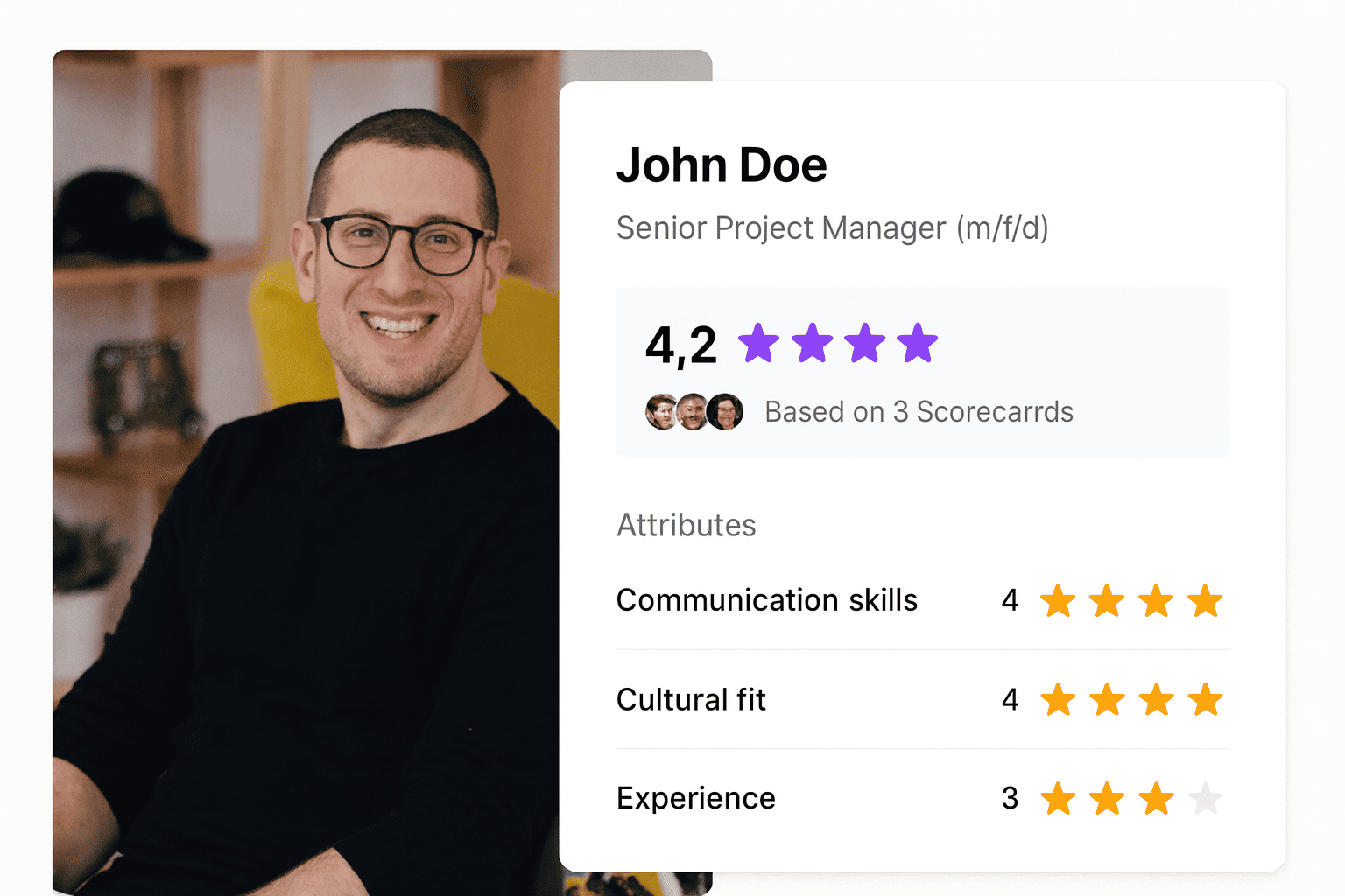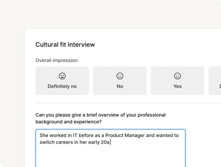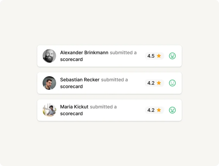 Build structured scorecards that match your job requirements. Use ready-made templates or create your own to evaluate candidates consistently and make clear, confident decisions.